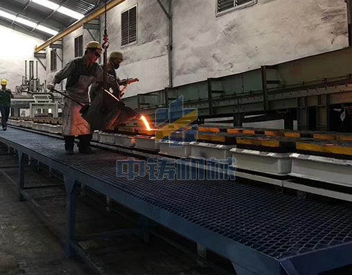1、全自動造型機打出來砂型直接在鏈板線上循環輸送,可以是單排雙列,也可以雙排雙列;